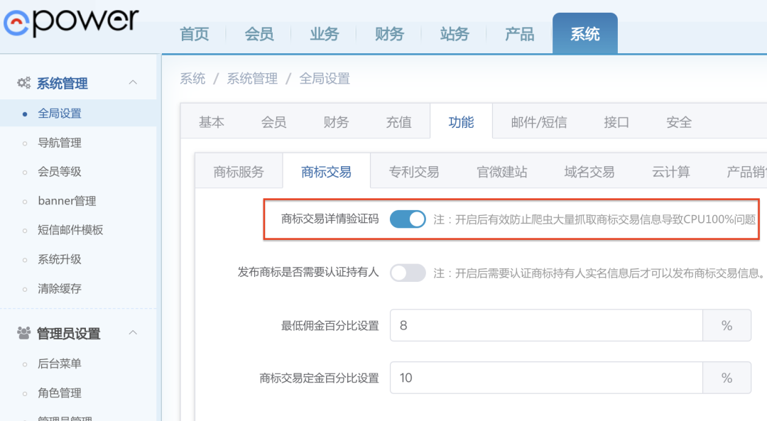 在管理员后台的“系统——全局设置——功能——商标交易”处,新增商标交易详情验证码开关功能,开启后有效防止爬虫大量抓取商标交易信息导致CPU100%问题。