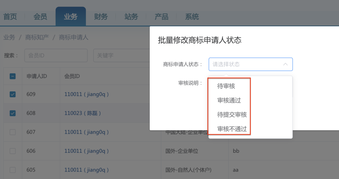 商标独立接口版,在管理员后台的“业务——商标申请人”处,商标申请人批量审核增加审核通过和审核不通过状态选项。