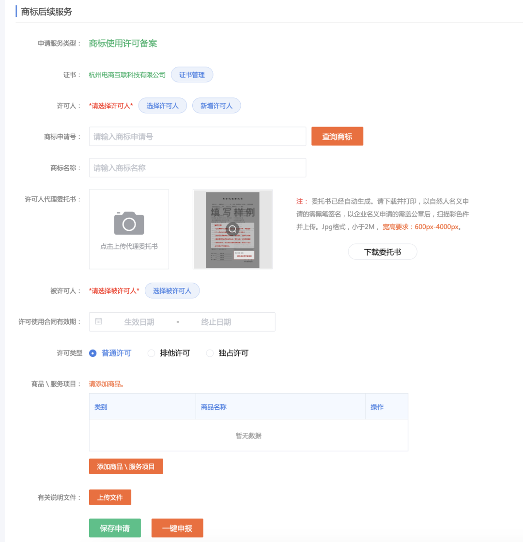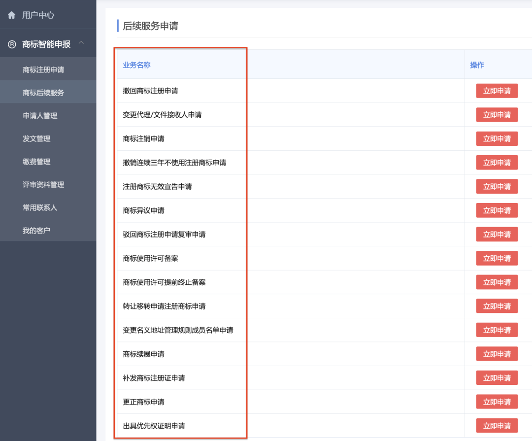 系统现已支持包括以下商标后续服务申请业务: