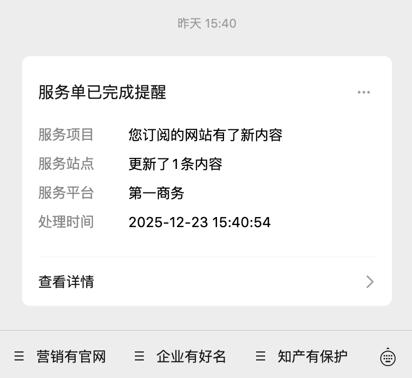 在系统有文章资讯、公告资讯、帮助资讯更新时,订阅了网站的用户将收到公众号如下提醒消息。