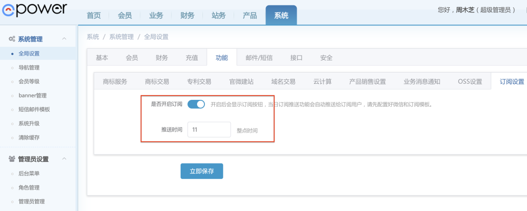 在使用前,管理员需要在微信公众号上设置好消息模板。在管理员后台“系统—全局设置—功能—订阅设置”处管理员可以设置是否开启订阅功能,可以设置消息推送时间。