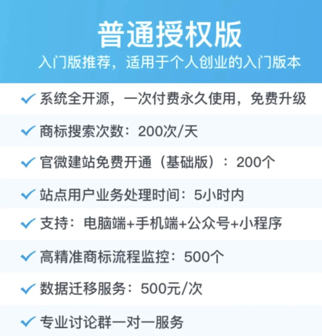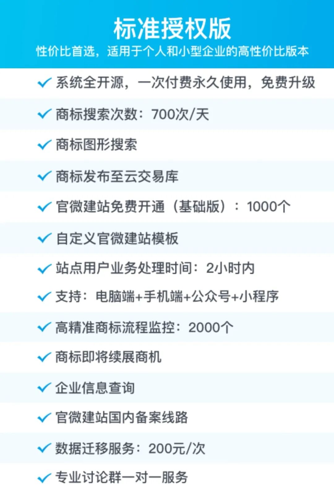 每日200次商标搜索 +500个流程监控 + 200个官网建设额度,完全满足初创期的业务量需求,避免了系统功能过剩造成的资金浪费,实现成本效益最大化。