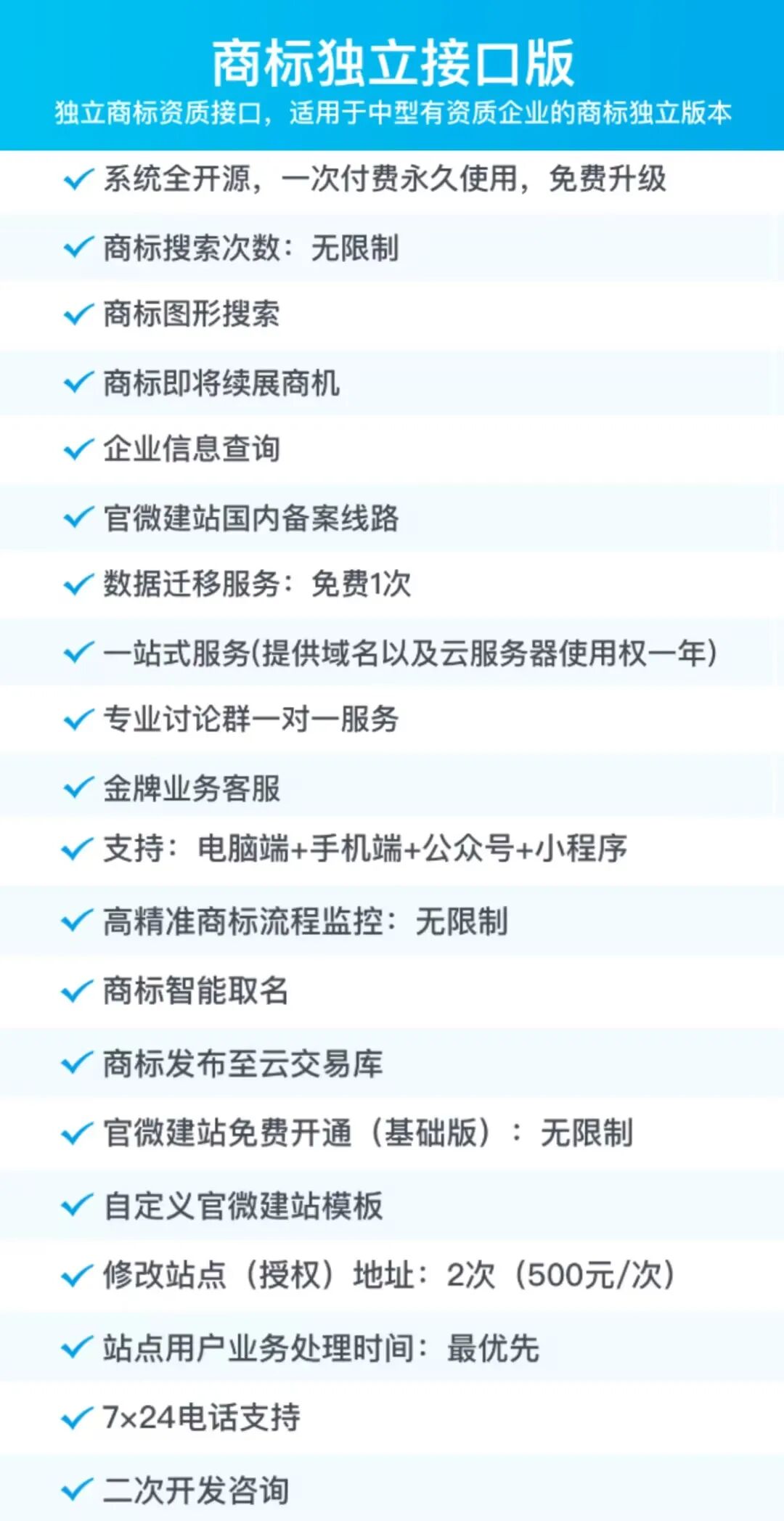 此版本的核心是独立商标资质接口和完整的系统主权,直接对接官方平台。