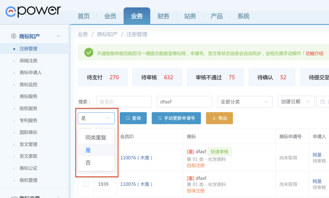 ePower第2516期升级:新增商标注册订单重复查询功能