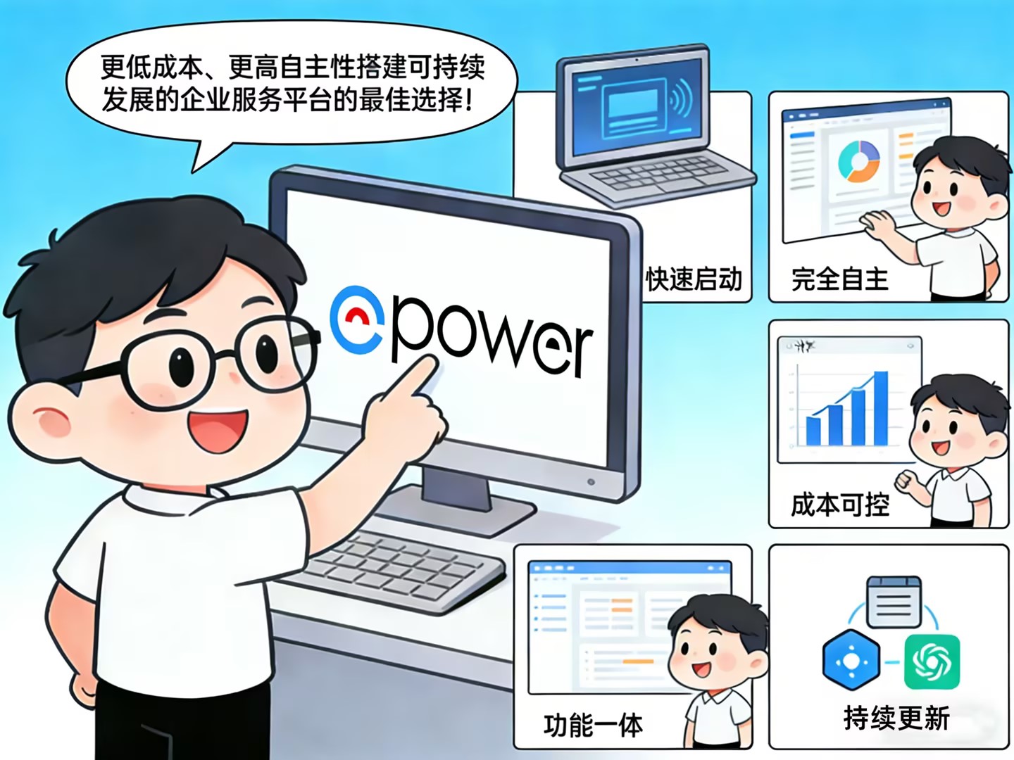 ePower致力于帮助企业更快运营、更全面布局、更轻松部署,以更低成本、更高自主性搭建可持续发展的企业服务平台,助力数字化转型与创业第一步,让理想轻松落地。