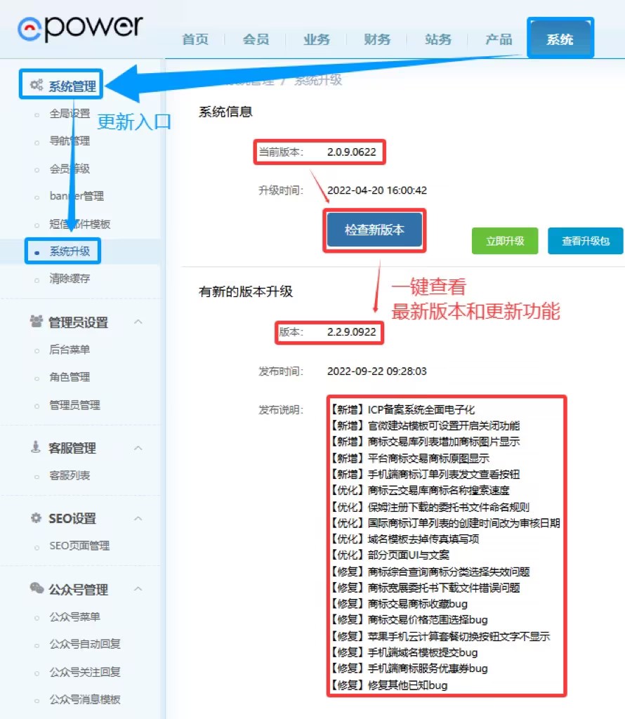 在ePower系统后台的首页或“系统升级”板块,用户可实现免费一键更新服务。只需点击“检查新版本”,即可查看最新版本与功能说明;进一步点击“立即升级”便可轻松完成升级。无需专业技术背景,也不影响正常业务运营,真正实现了“升级零负担,运营不间断”。