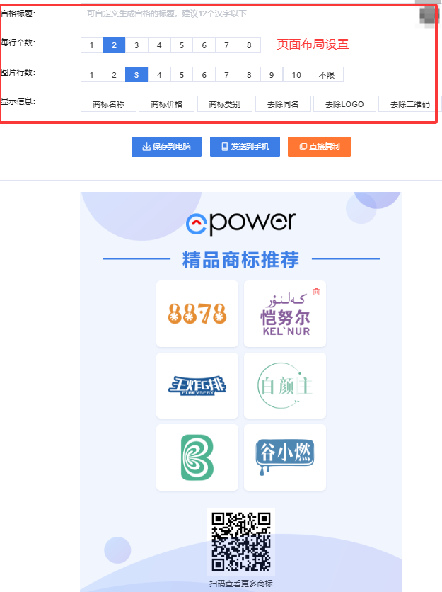 在客户引流方面,ePower创新推出一键智能分享宫格功能,让推广更省心高效。企业只需在系统内操作“商标交易—选中要分享的商标—制作分享宫格”,即获得美观的、自带商标库入口二维码的分享页面,无需再手动处理,直接保存或一键分享,用户扫码便直接进入商标库选购,实现“推广—选购”无缝衔接,显著降低引流成本,提升客户转化率。