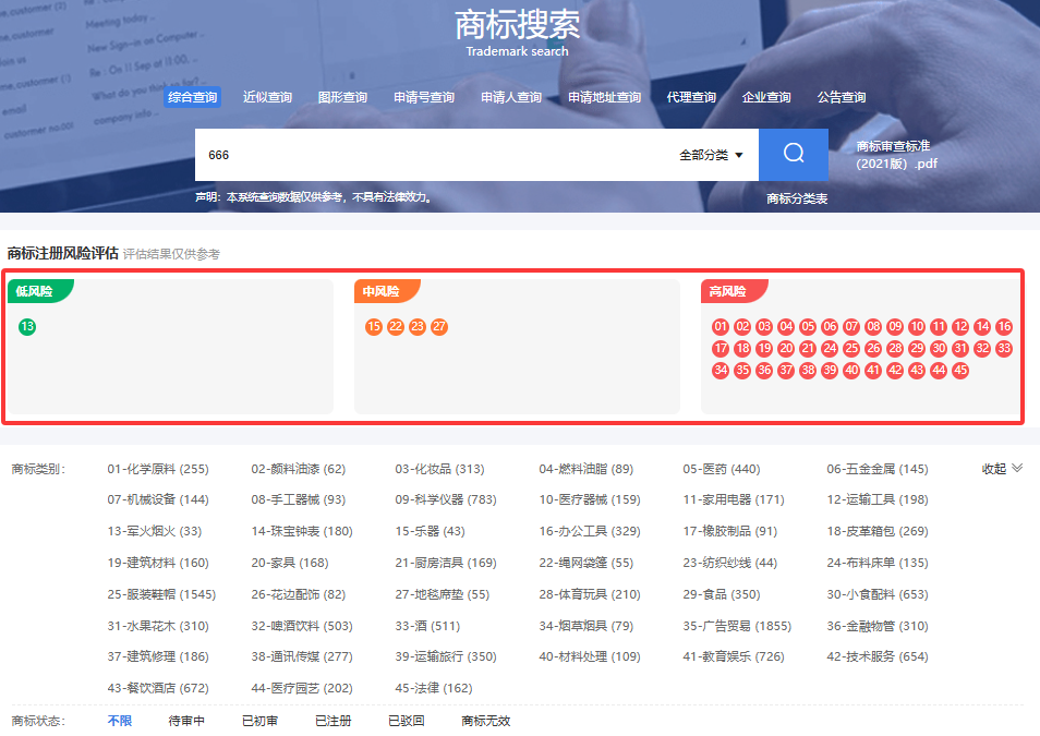 用户输入商标名称,系统自动在45个类别中进行综合、近似、图形等多维度检索,并智能生成风险等级评估——低、中、高三档一目了然。用户可据此及时调整商标申请策略,大幅提升注册成功率。对您的平台而言,这不仅意味着更专业的服务能力,也带来更高的用户满意度。