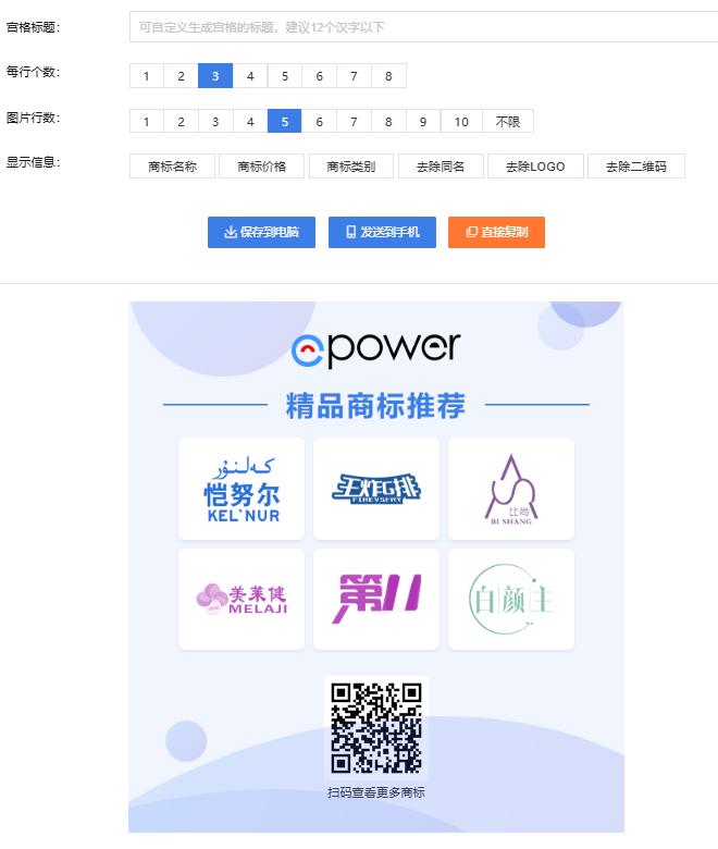 企业在平台选中要分享的商标,可一键制作带二维码的分享宫格图——系统自动排版,并嵌入商标库入口二维码,无需额外设计即可保存或直接分享。用户扫码直接进入商标库选购,从分享到交易,路径最短、转化最高。