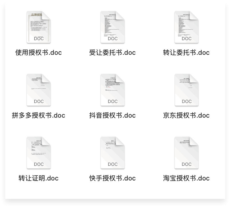只需要用户填写一次商标信息、转让人信息、受让人信息、代理机构等信息,可一键生成商标转让所需的9份文件——包括使用授权书、受让委托书、转让委托书,以及拼多多、抖音、京东、快手、淘宝等平台授权书和转让证明。规范高效、减少人工失误。